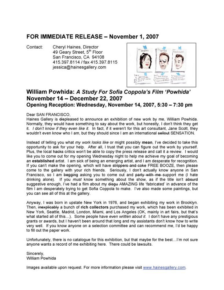 Opening November 14th at Cheryl Haines Gallery, San Francisco A Study For Sofia Coppola’s Film ‘Powhida’ Video and Paintings by William Powhida