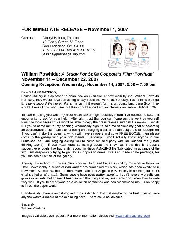 Opening November 14th at Cheryl Haines Gallery, San Francisco A Study For Sofia Coppola’s Film ‘Powhida’ Video and Paintings by William Powhida