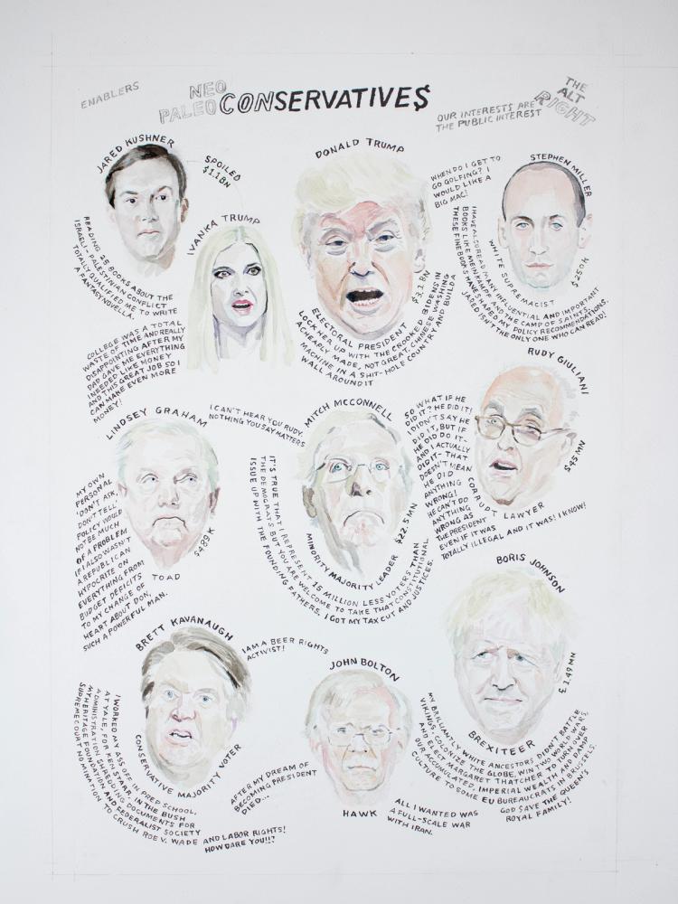 Artist’s note: The works were commissioned to accompany essays exploring the political legacy of the disastrous Bush administration. The paintings were executed in the former President’s self-taught painting style. The first painting was reversed horizontally for publication while the last painting of Hamid Karzai did not make it into the issue.