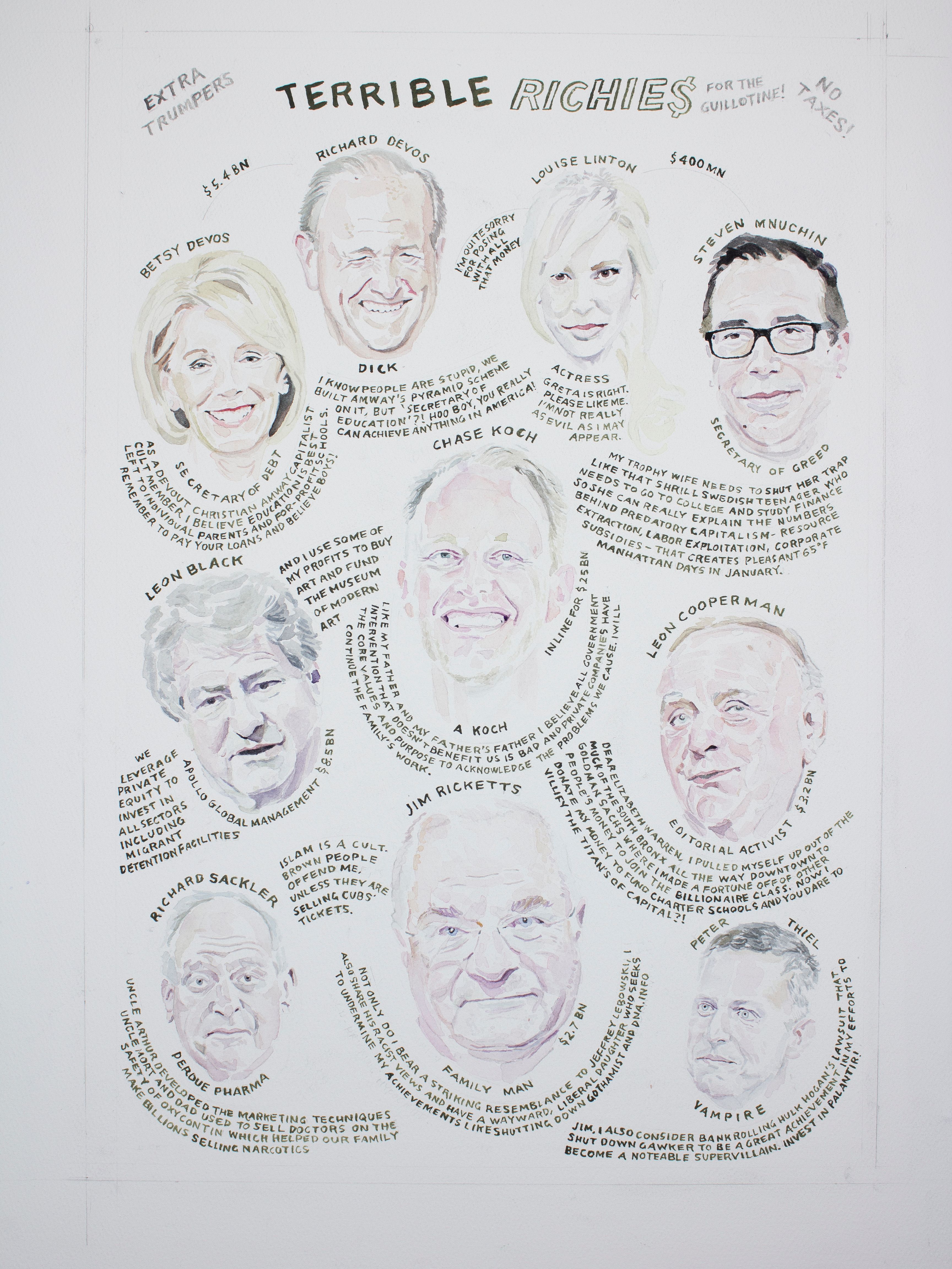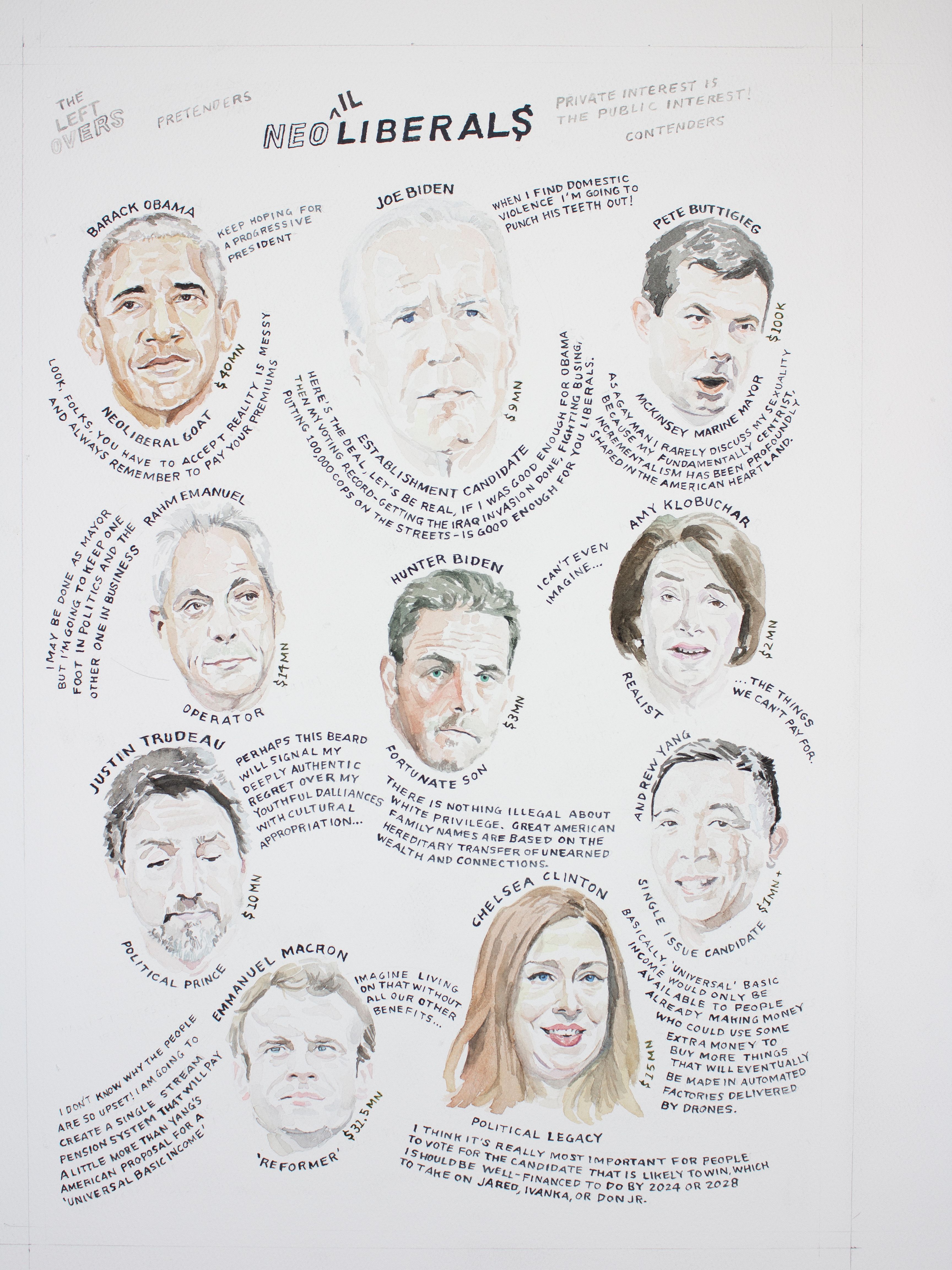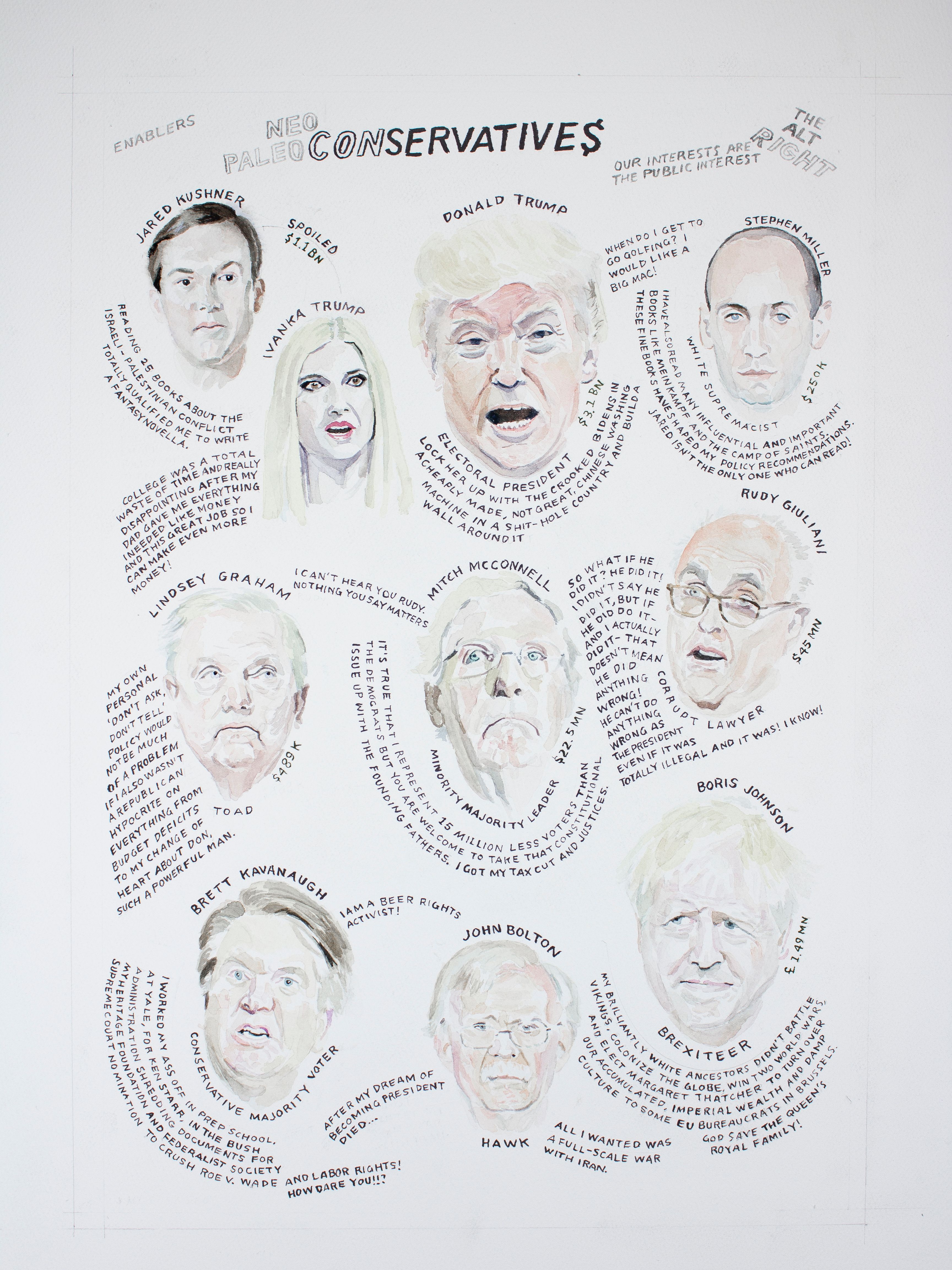 Artist’s note: The works were commissioned to accompany essays exploring the political legacy of the disastrous Bush administration. The paintings were executed in the former President’s self-taught painting style. The first painting was reversed horizontally for publication while the last painting of Hamid Karzai did not make it into the issue.
